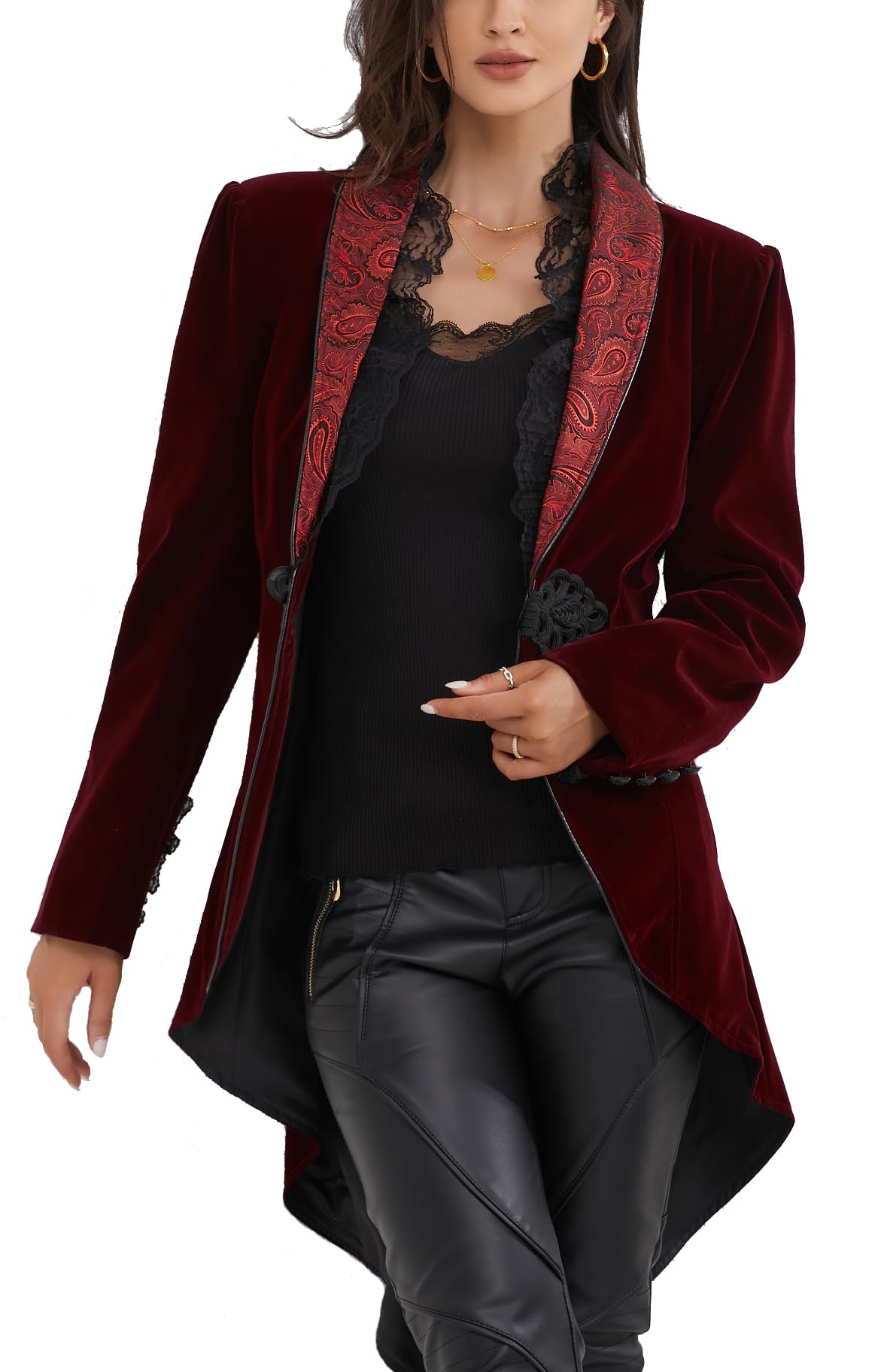 SUPLEAP Women's Victorian Lace Tailcoat Gothic Steampunk Jackets Medieval Lapel Coat Top XXL Red
